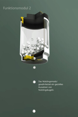 Doch die Drohne kann ein Problem nicht nur sichtbar machen, sondern es auch direkt beheben. Dafür wird das Verteilermodul an der Drohne angebracht. Dieses ist mit Nützlingskugeln befüllt, die zielgenau dort ausgebracht werden können, wo sie benötigt werden. Hierbei wird ein natürliches Ausgleichprinzip von Ökosystemen genutzt. Schädlinge haben Fressfeinde (Nützlinge), die ihren Bestand normalerweise unter Kontrolle halten. Werden also Nützlinge auf dem Feld ausgebracht, dann wird der Schädlingsbefall innerhalb weniger Tage stark eingedämmt – mit ebenso großem Erfolg, wie ein Pestizideinsatz, nur ohne Spätfolgen oder Nebenwirkungen.